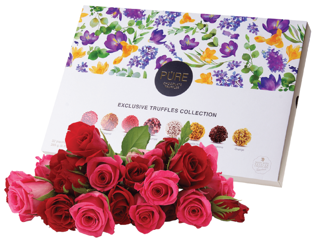 Komplektā ietilpst 9 rozes jūsu izvēlētā krāsā, apsveikuma kartiņa ar jūsu iesūtītu tekstu un kāda no “Pūres” šokolādes trifeļu kolekcijām.